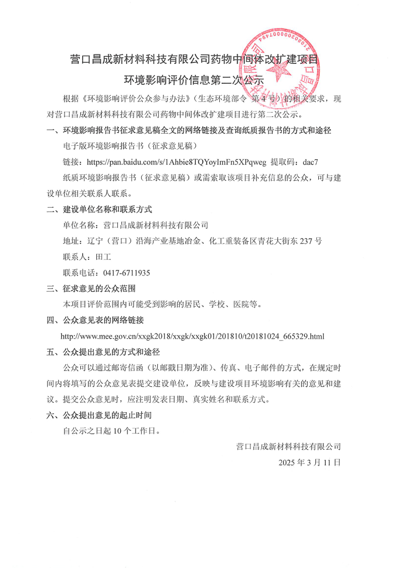 營口昌成新材料科技有限公司藥物中間體改擴(kuò)建項(xiàng)目環(huán)境影響評(píng)價(jià)信息第二次公司
